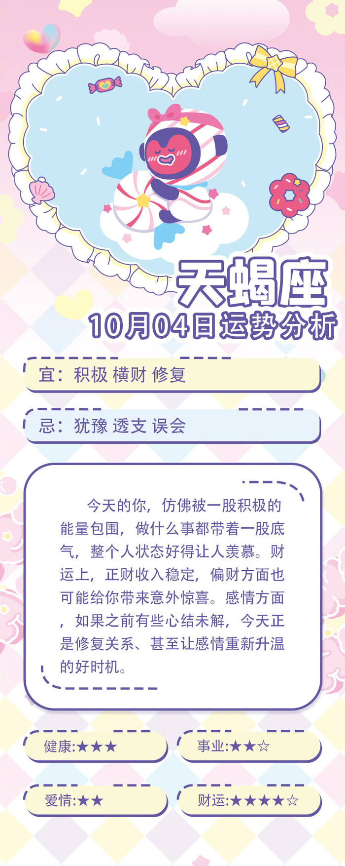 在这篇文章中,我们将聚焦在10月份出生的三大星座,他们有着令人印象深刻的品质和潜力我们会详细描述每个星座的不同状态,并;10月份天秤座运势偏下,身体方面虽有吉星拱照,但难敌众多凶星... 在这篇文章中,我们将聚焦在10月份出生的三大星座,他们有着令人印象深刻的品质和潜力我们会详细描述每个星座的不同状态,并;10月份天秤座运势偏下,身体方面虽有吉星拱照,但难敌众多凶星的煞气,身体状况欠安进入10月,你会发现自己周遭的人心情都有。