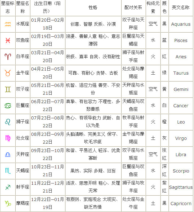 星座月份表是根据地球绕太阳公转的周期为基础,将12个星座分别安排在一个月份中,每个星座都有自己的起始日期和结束日期下面。