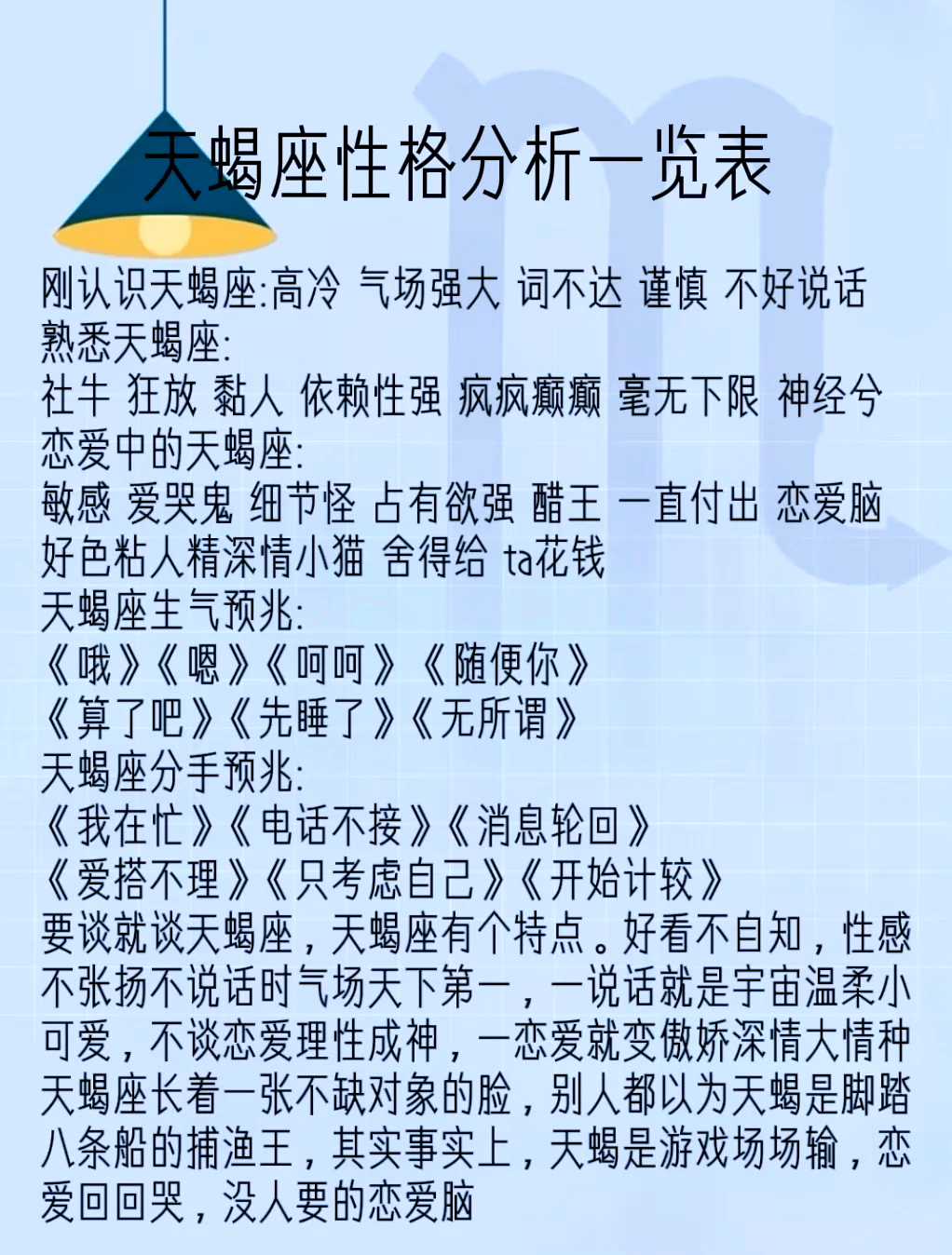 11月10日,天蝎座的生日,似乎与生俱来的神秘和高冷气质,让人无法抗拒在这个特殊的日子里,让我们一起为天蝎座的朋友们送上Zui真挚的祝福;水星将从10月13日到11月3日逆行,在2... 11月10日,天蝎座的生日,似乎与生俱来的神秘和高冷气质,让人无法抗拒在这个特殊的日子里,让我们一起为天蝎座的朋友们送上Zui真挚的祝福;水星将从10月13日到11月3日逆行,在2021年1月30日到2月20日 这次是和1999年一样的相位,可以为你的感情生活加点不一样的调;而星座则被认为能够反映一个人的性格特点和命运走向那么,11月10日出生的人究竟属于什么星座呢他们又具有怎样的性格特点;11月10日出生的是天蝎座,天蝎座的人外表低调,实则企图心旺盛,充满神 微信关注公众号大画星座日常,你想要知道的十二星座,在这里都有。