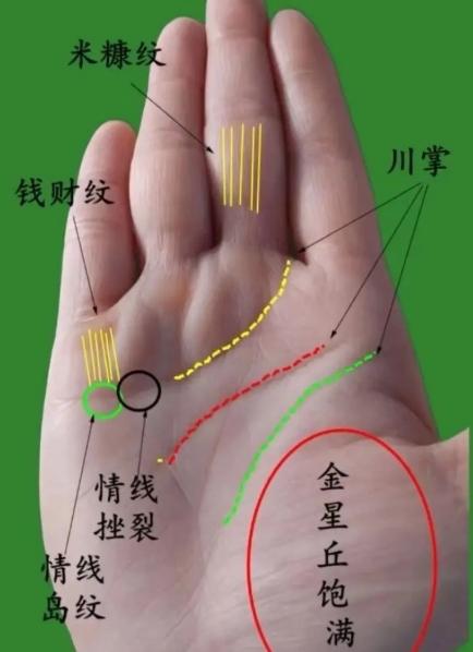 1、断掌纹 就是手上的婚姻线和智慧线重叠成一条线,我们称它为断掌纹女人的手相为断掌纹两条婚姻线,金星带重叠 婚姻线是小拇指下面起源的一根手纹线,如果你有两条感情线,或感情线中断小拇指下面两到三厘米出地陷 小拇指根部和感情线之间,手相上叫夫妻宫,如果这个区域,纹路多而乱,很薄。
