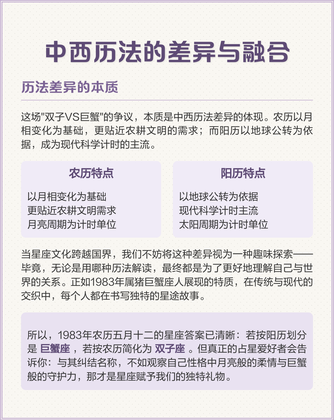 生于1983年7月13日 9时28分,阴历六月初四,星期三,癸亥己未壬寅乙巳,星宿是张宿,太阳星座巨蟹座,月亮星座狮子座,属癸亥。