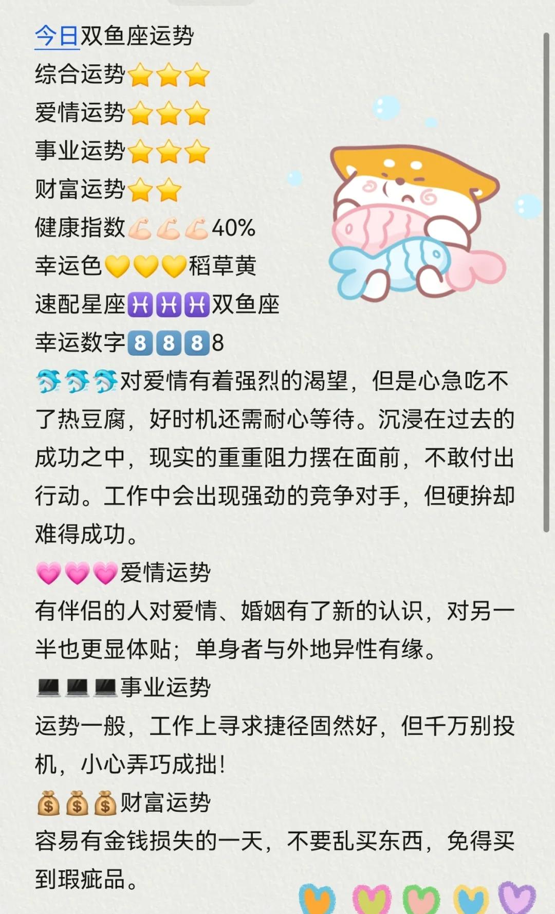 3、2024年3月22日 今日的双鱼座女生的财运也非常亨通你可以尝试投递简历或者参加面试,今日的运势会给你带来好运今日的双鱼座女生的健康状况也非常良好。
