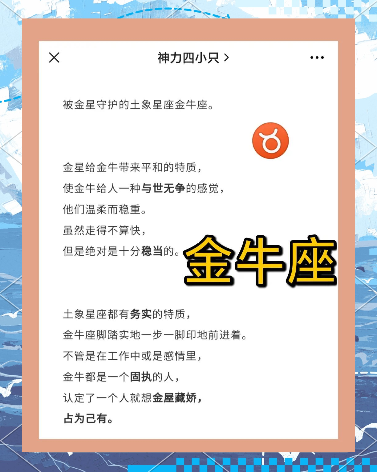 2、金牛座不爱记仇,但谁对他好,谁对他不好,他还是记得很清楚的金牛注定不是一个平常的星座,最不会讨人欢心,最重自尊,最讲。