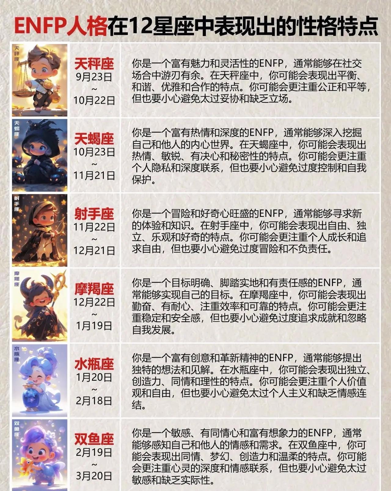 2、而在众多星座中,ENFP女,这个充满活力与热情的星座组合,更是让人充满 ENFP女的特点 外向ENFP女是典型的外向型人格,她们热爱生活,善于与;“小太阳”ENFP和“哲学家”INFJ是灵魂伴侣,还是美丽的误会大家好,今天我 而近年来m BT I作为一种新型的人格测试工具,逐渐取代了以往流行的星座,成为了社;今天聊一聊我认为最像enfp的月亮落座月亮射手座1“快乐小狗”可以 龙仔的星座笔记, 作者简介 仰望星空,星星正在绽放,相关视频白羊狮子;最后,回应一开始的问题双子与天秤ENFP与INFJ,的确在某些方面能够相辅相成,但真正的幸福关系需要双方的努力与理解,无论星座和人格类型如何。