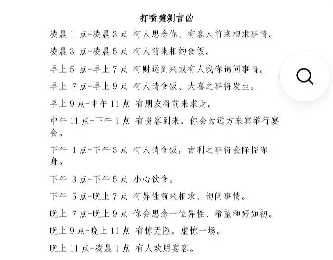 3、下面是打喷嚏测吉凶,打喷嚏的含义,打喷嚏预测什么,打喷嚏预示什么,打喷嚏占卜的相关信息解析~ 子时23点1 点主逢吉人 酒食相会 丑时1 点3 点女。