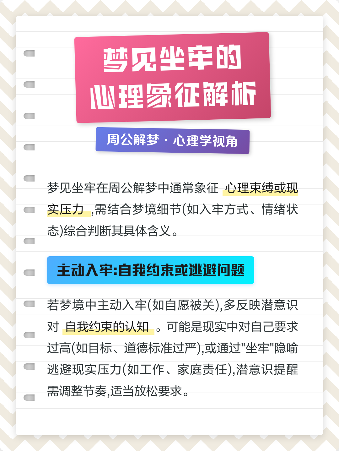 梦见自己坐牢,预示着最近的财运不佳,建议你要多注意自己的钱包梦见自己犯了事事,要被坐牢,预示着家里最近会闹些矛盾。梦见要去坐牢周公解梦,闷闷不乐,家里出了点事让你放心不下,忙着工作... 梦见自己坐牢,预示着最近的财运不佳,建议你要多注意自己的钱包梦见自己犯了事事,要被坐牢,预示着家里最近会闹些矛盾。
