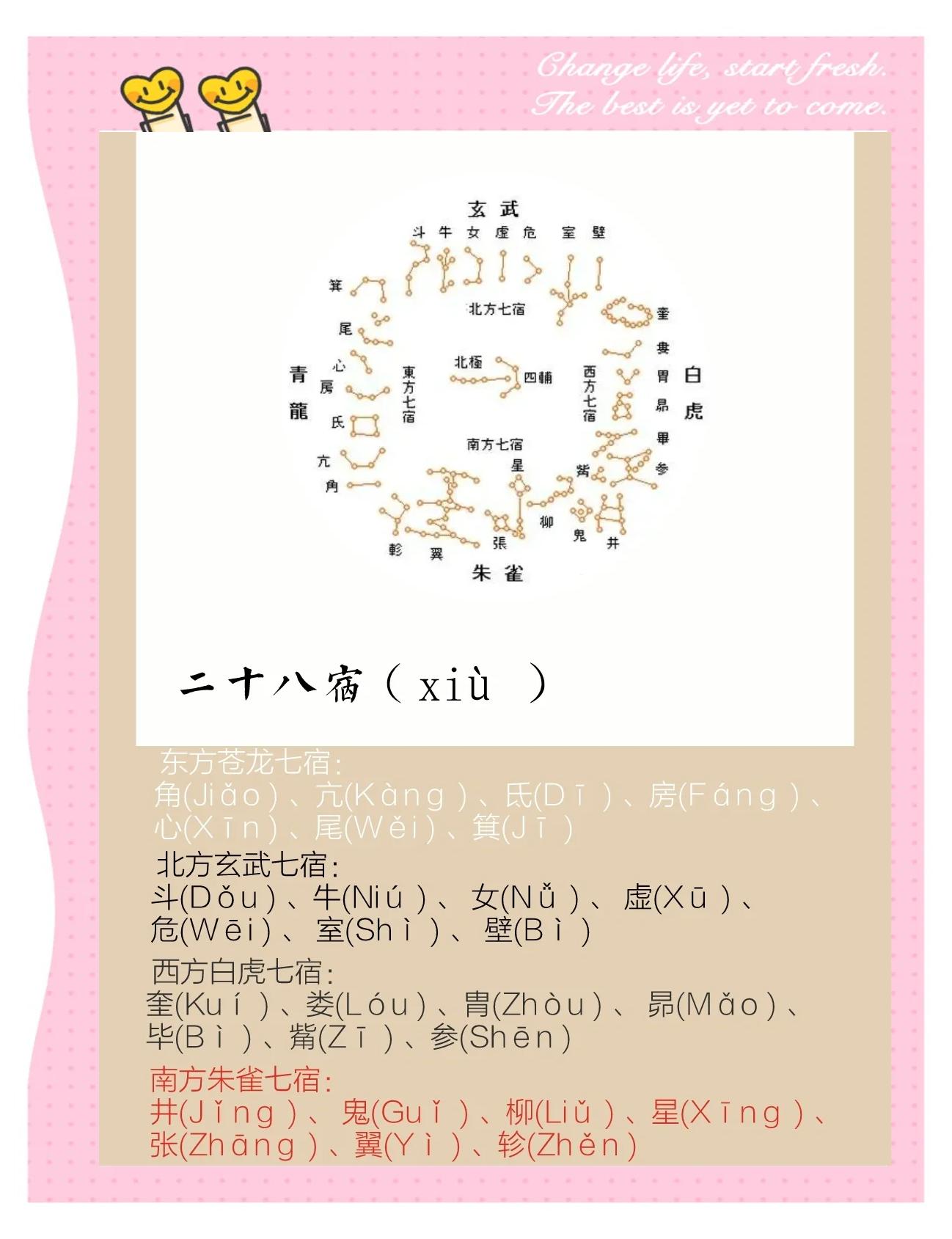 二十八星宿是中国古代天文学说之一,它把南中天的恒星分为二十八群,依据其环绕在天体中,周而复始的运转不停,沿着黄道和赤道。