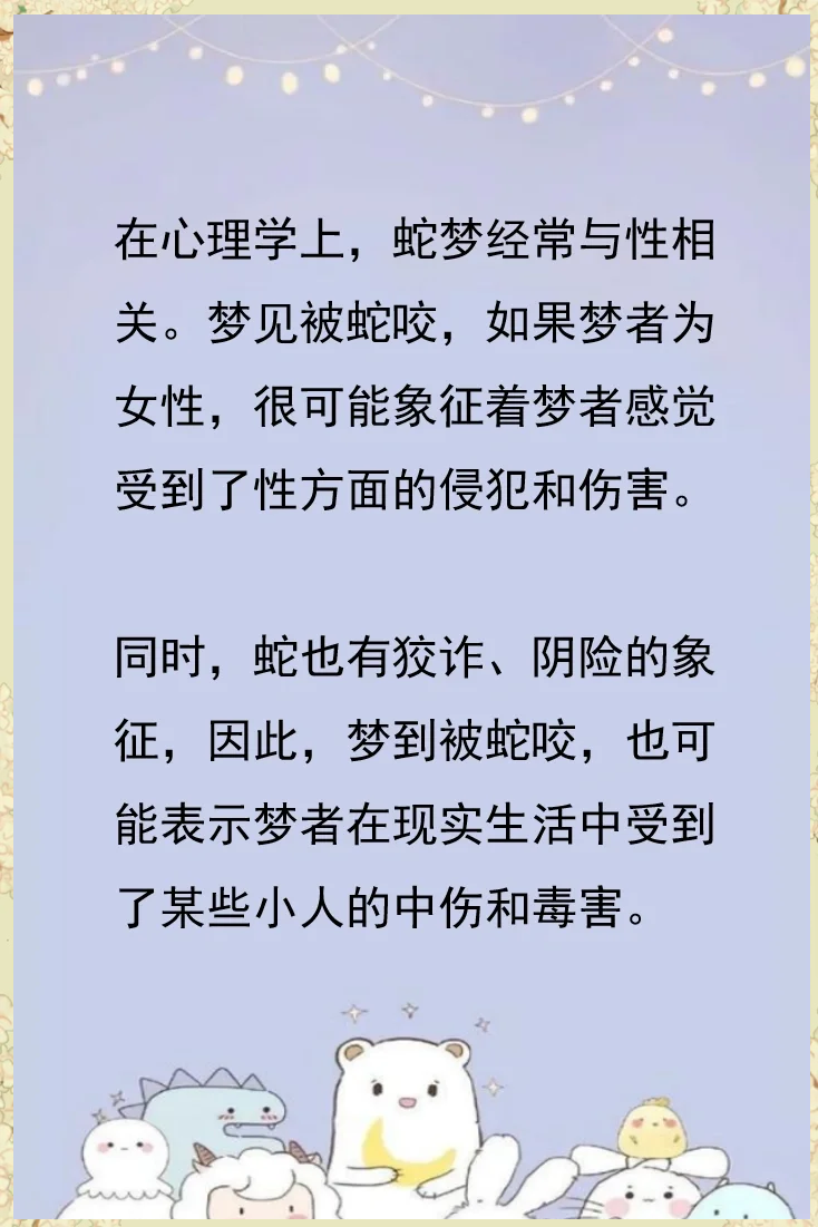 3、当然,古人解梦,最讲究“因人而异”,你发现没有,这才是传统智慧最精妙的地方对于商人而言,梦见被蛇咬出血,往往被看作是。