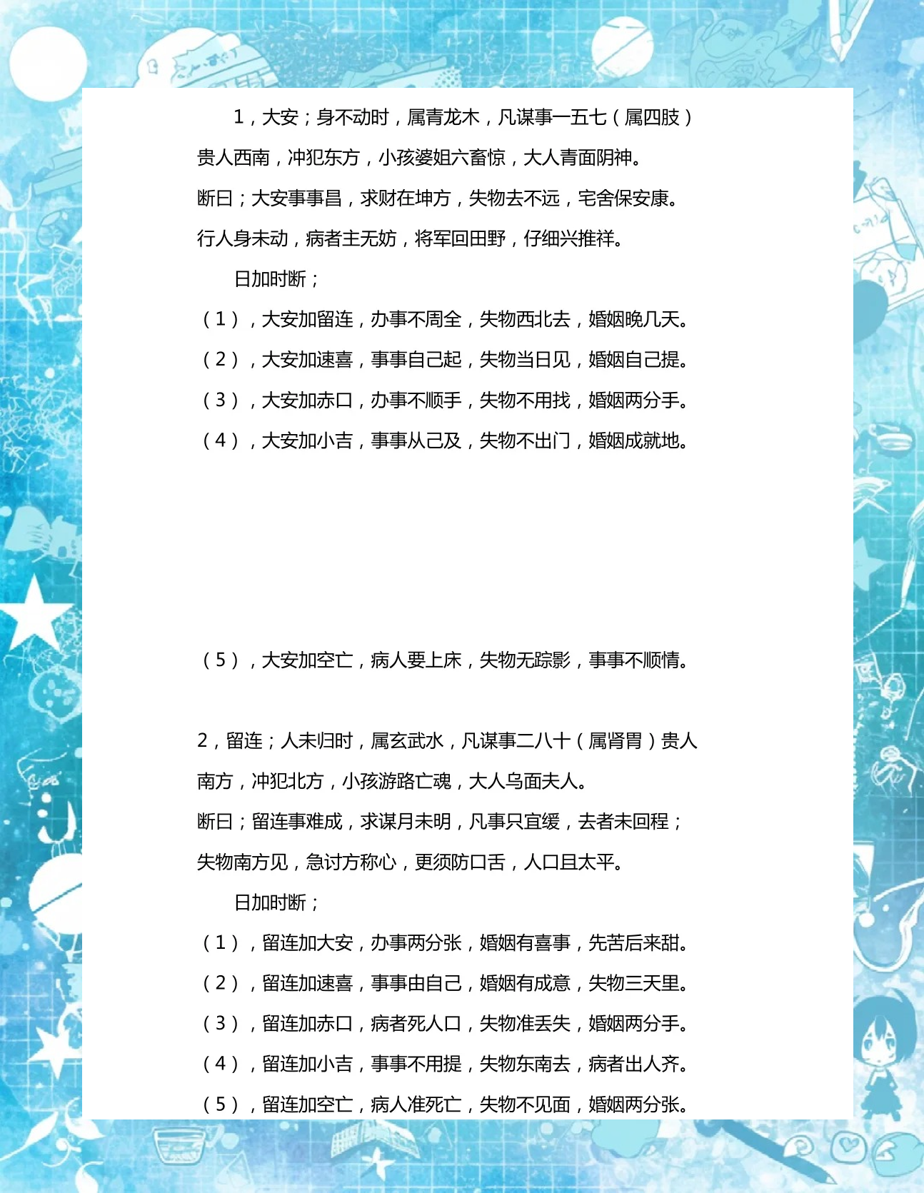 大六壬可推断之事物范围是很广的,有财运健康爱情婚姻事业交易官司家居住宅宅运等而且能准确地断定,小六壬赤口起在姻缘上按单卦就按赤。