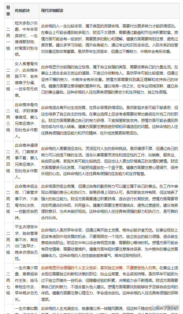 称骨测算几两命一览表