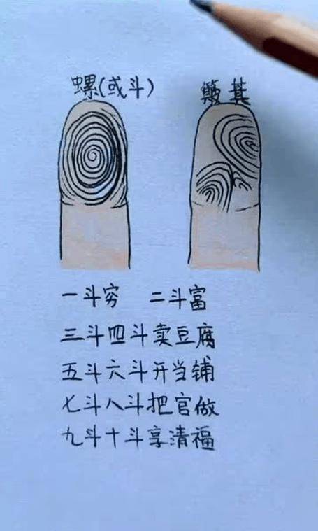 指尖上的手纹分为斗和簸箕,斗纹又称螺纹涡纹,斗纹呈圆圈状簸箕又称流纹,呈条纹状民间有一斗穷二斗富,三斗四斗卖豆腐,五斗六斗开当铺。