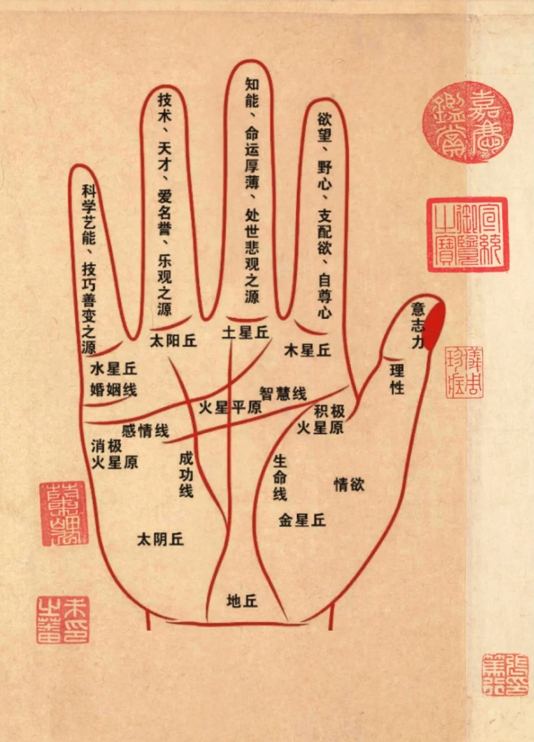 人的手掌五指可以伸屈自如,这是动物所不能做到的,而大拇指又可以不受其他手指的控制而弯曲自如,故大拇指为五指之首,在手相。
