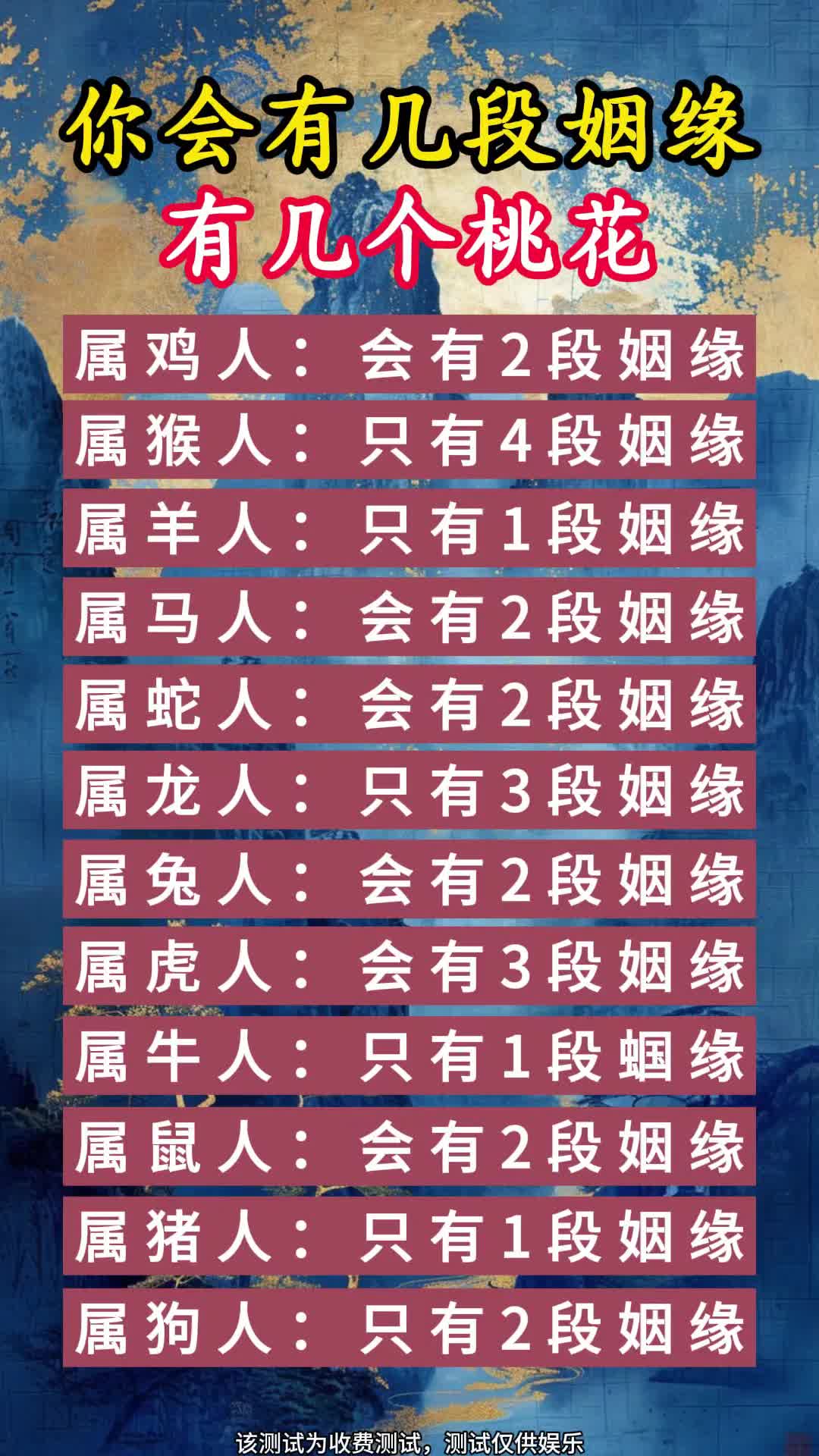 一姻缘测试免费小程序 凡婚配,双方的出生年命要求相合或相生,不可相克,否则,谓之命里相犯如甲子年生人,年命属海中。
