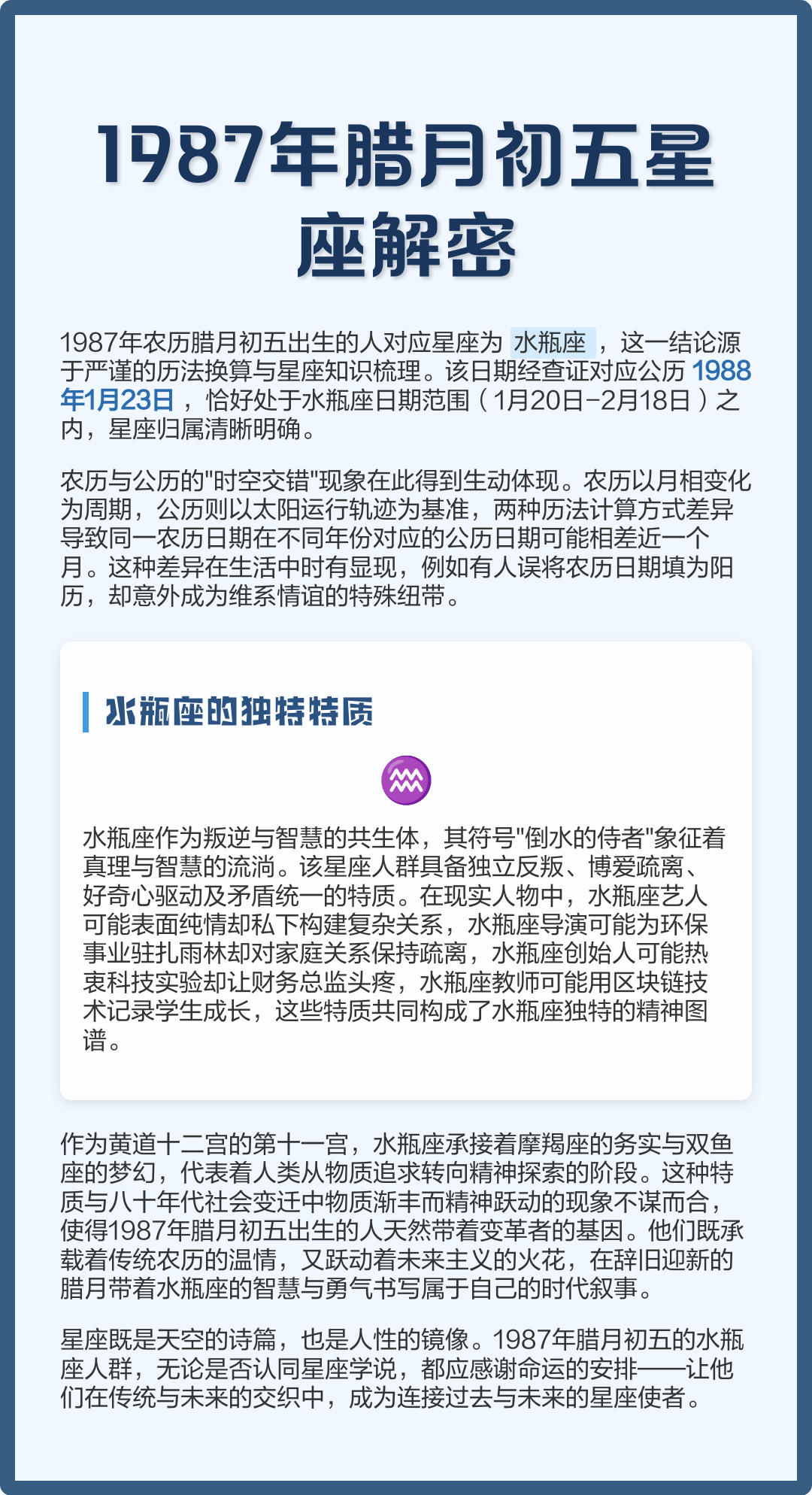 2025年4月29日 1987年出生的星座查询 星座是按阳历公历日期划分的,以下是12星座对应的日期范围以及1987年出生在此日期范围内对应的星座 1 白羊座3月21日 4月1。... 2025年4月29日 1987年出生的星座查询 星座是按阳历公历日期划分的,以下是12星座对应的日期范围以及1987年出生在此日期范围内对应的星座 1 白羊座3月21日 4月1。
