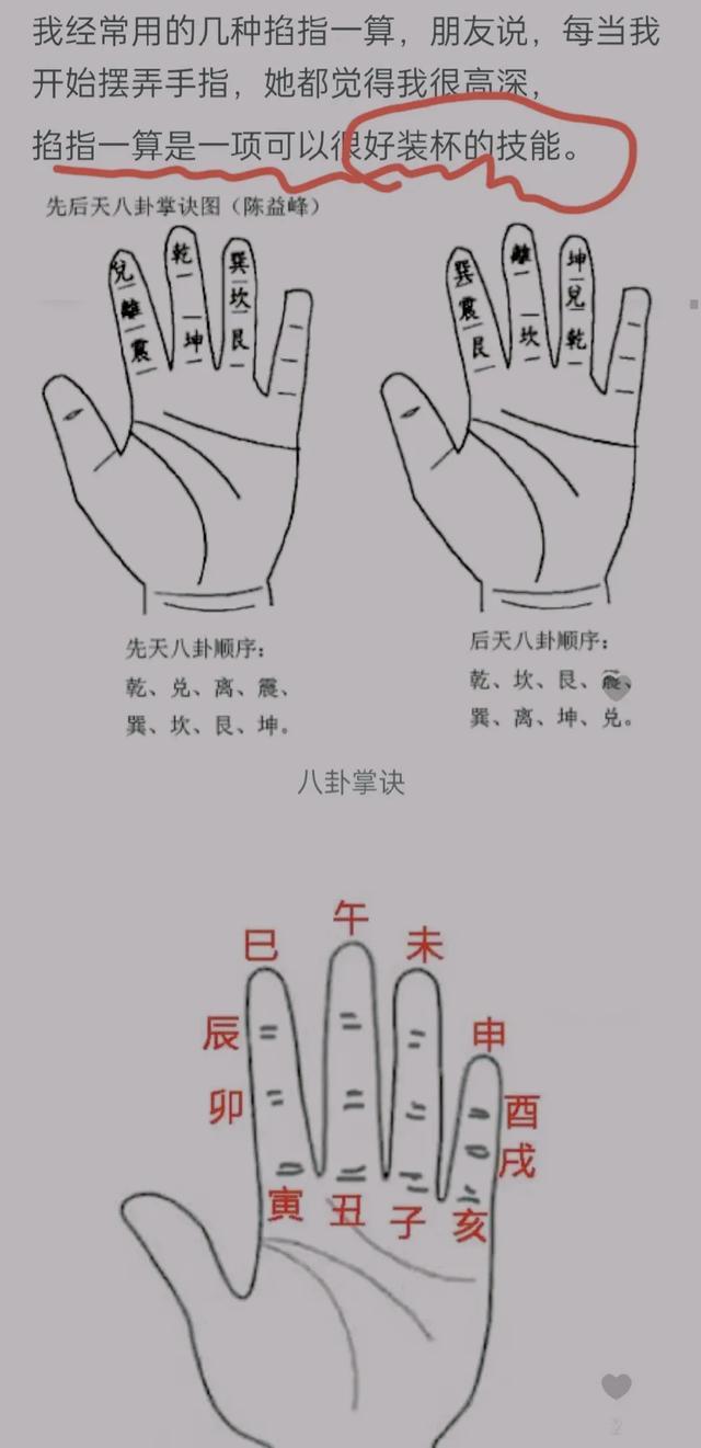 15、古人“掐指一算”并不神秘,“掐指”只是古人在占算时,将天干地支八卦五行等信息按照一定规则排纳入左手食指到小拇指的。