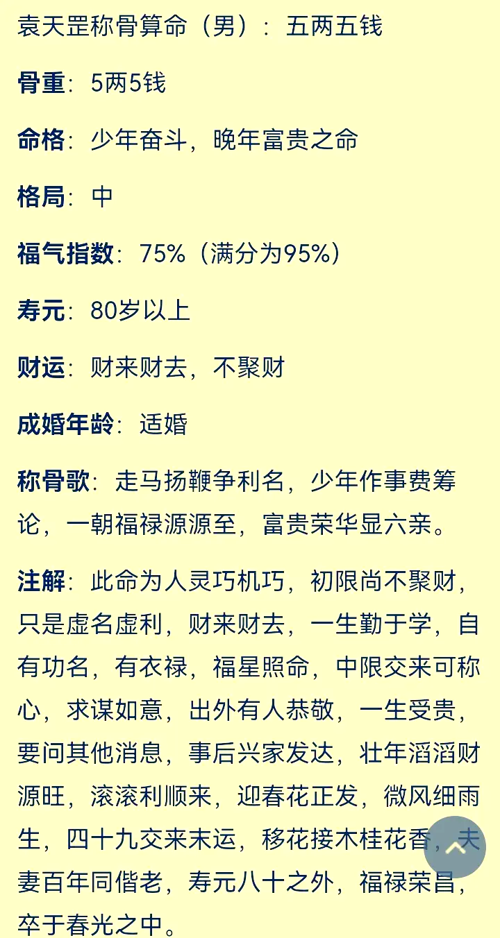 八字算命,免费算命,生辰八字算命,算命网,周易算命,称骨算命,算命婚姻,抽签算命,测字算命,算命大全,瓷都算命,八字算;称骨算命是算命方法的一种,和生辰八字算命紫微斗数算命异曲同工... 八字算命,免费算命,生辰八字算命,算命网,周易算命,称骨算命,算命婚姻,抽签算命,测字算命,算命大全,瓷都算命,八字算;称骨算命是算命方法的一种,和生辰八字算命紫微斗数算命异曲同工,略有不同,虽然都是用出生的时间算命,但比较而言,称骨算;擅长蒙,准确率高于501%废话不多说,先上小程序国学小助手,内置称骨算命功能,点击图片即可使用说起称骨算命,很多人;称骨算命根据四柱八字推算出来,自然是一种静态的推算,人的命运与气数也不完全是八字所定,而且后天也可以改变一些 命由己。