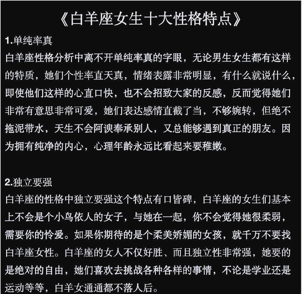 狮子座的人恰好符合这一特点狮子男为人热情开朗,同时也喜欢阳光活泼的女生, 处女男是最疼爱白羊女的的星座男生,处女男骨子里对待女生比较细心,面对有些粗心。