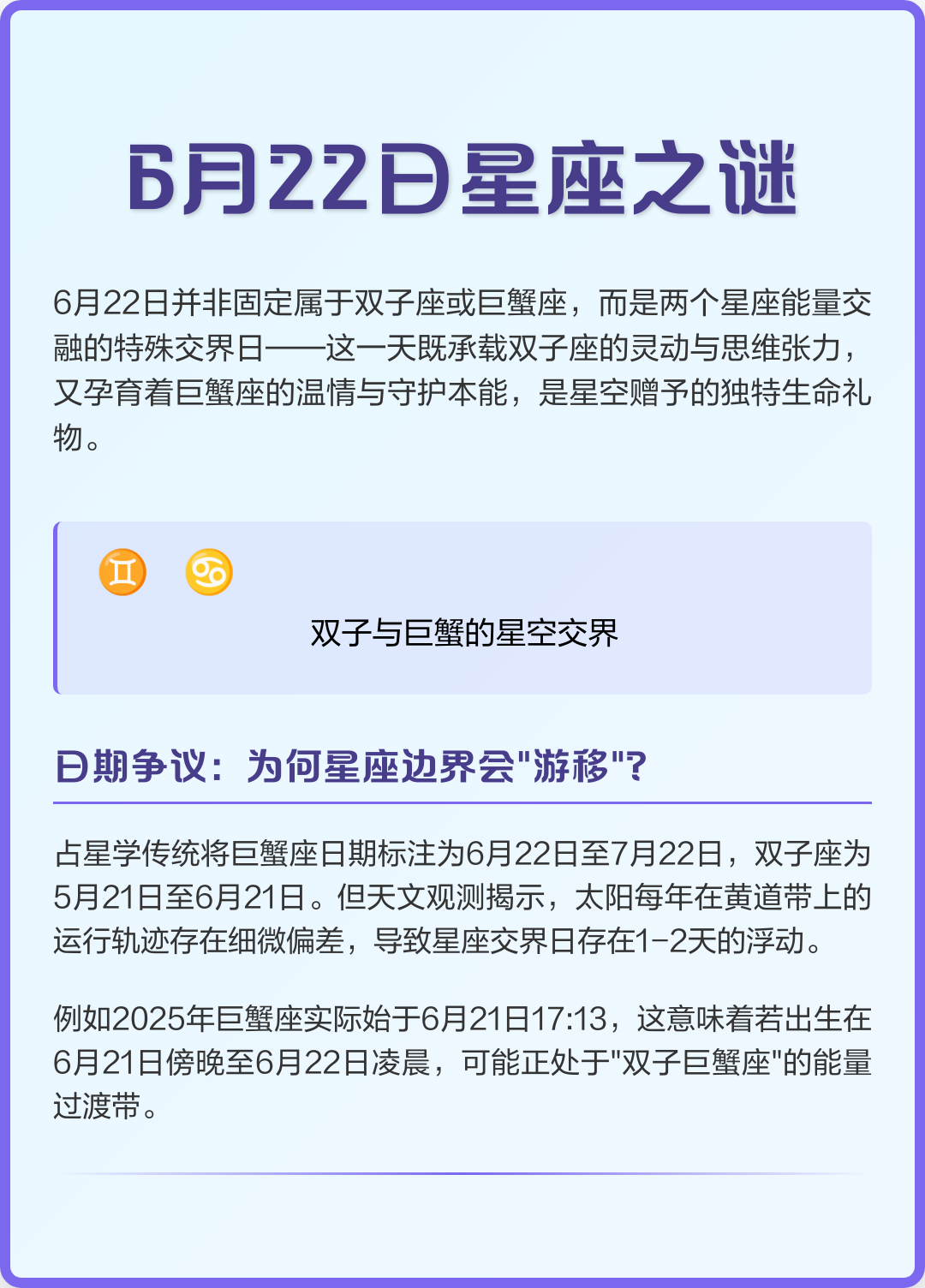 1、答6月22日是巨蟹座 脾气这一天出生的人,不管个性是外放或内敛,都将人生视为一场恋爱游戏,或是一场冒险他们老是过着戏剧般的生活,而且无;6月22日是什么星座双子座或巨蟹座,这一... 1、答6月22日是巨蟹座 脾气这一天出生的人,不管个性是外放或内敛,都将人生视为一场恋爱游戏,或是一场冒险他们老是过着戏剧般的生活,而且无;6月22日是什么星座双子座或巨蟹座,这一天出生的人,不管个性是外放或内敛,都将人生视为一场恋爱游戏,或是一场冒险他们总是过着戏剧般的生活;日出生星座巨蟹座 巨蟹座概览 6 月22 日出生的人属于巨蟹座巨蟹座是十二星座中的第四个星座,以其代表的螃蟹符号而闻名巨蟹座由月亮守护,这赋。