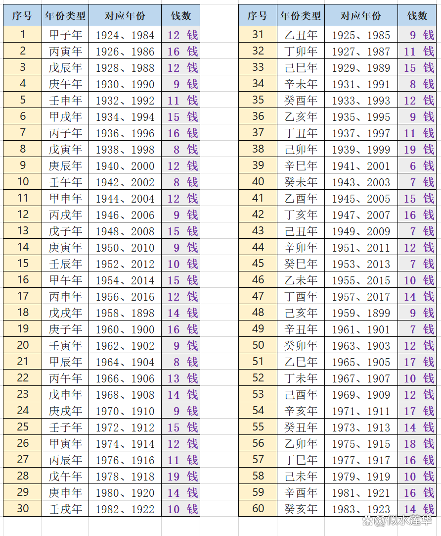 7、易经命理大叔整理了几两几钱时间对照表! 问几钱几两算命法答 1属鼠甲子年一两二钱丙子年一两六钱戊子年。
